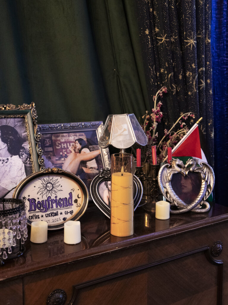 Past the busy Myrtle Ave intersection and through the glass doors, the space is like a witch and antique collector’s living room. Its charm is in the details: deep blue limewash walls, secondhand furniture, mismatched chandeliers, and random fixtures from Mustafa’s mom’s house.