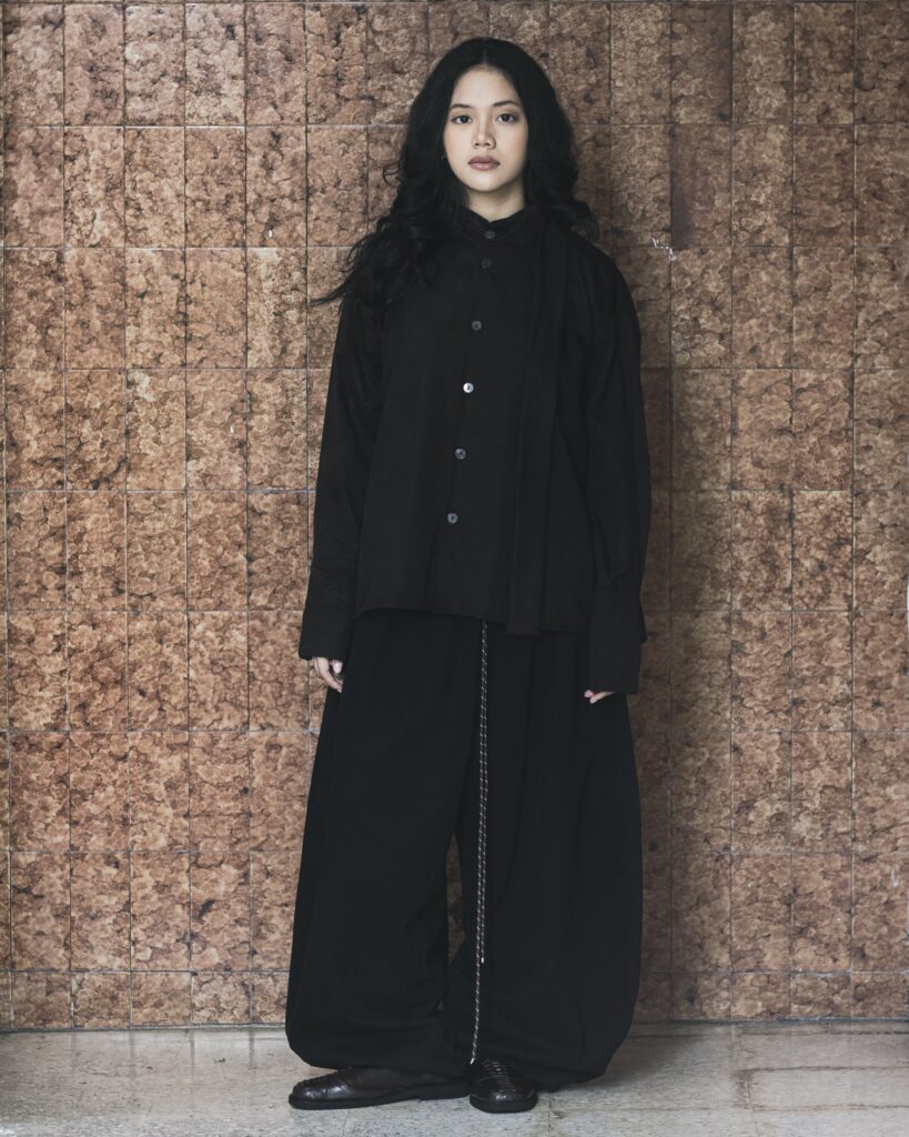 On the clothing design, Fauzi said,“We don’t anchor ourselves to a single cultural reference, but we do take fragments from various sources. For instance, in our jacket designs, there are traces of the beskap’s structure and silhouette, though these elements are softened and reinterpreted through multiple iterations. In a previous collection, we explored an overskirt that subtly referenced kain samping. Since we don’t rely heavily on prints or patterns, our focus shifts more towards how garments drape, fall, and move on the body. Those qualities become our main points of reference rather than direct visual quotations.”