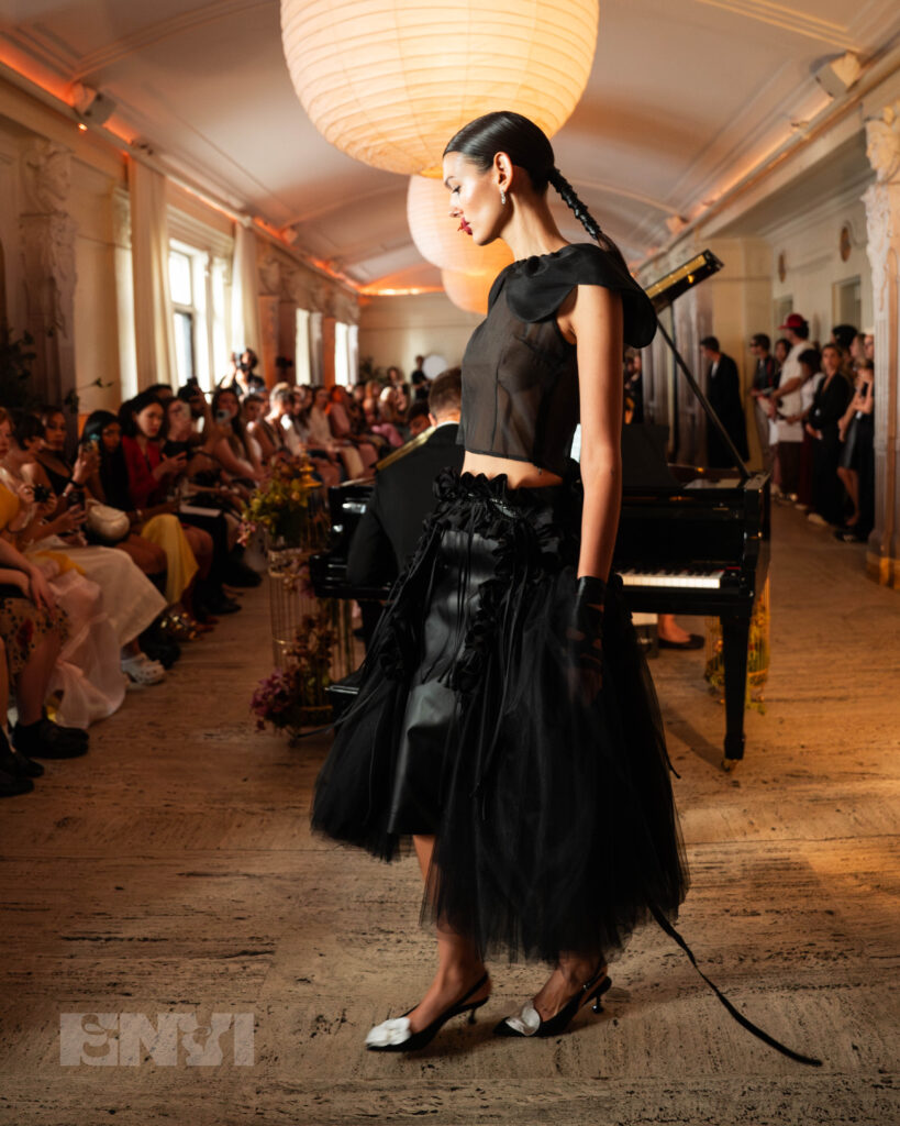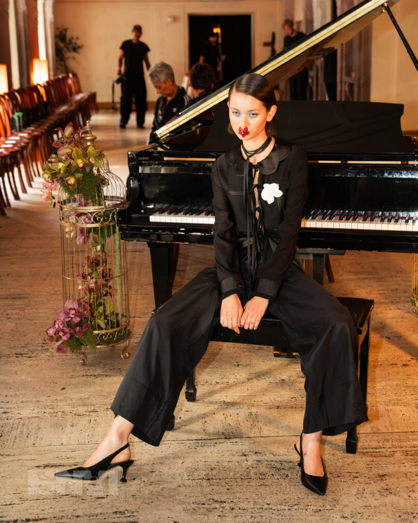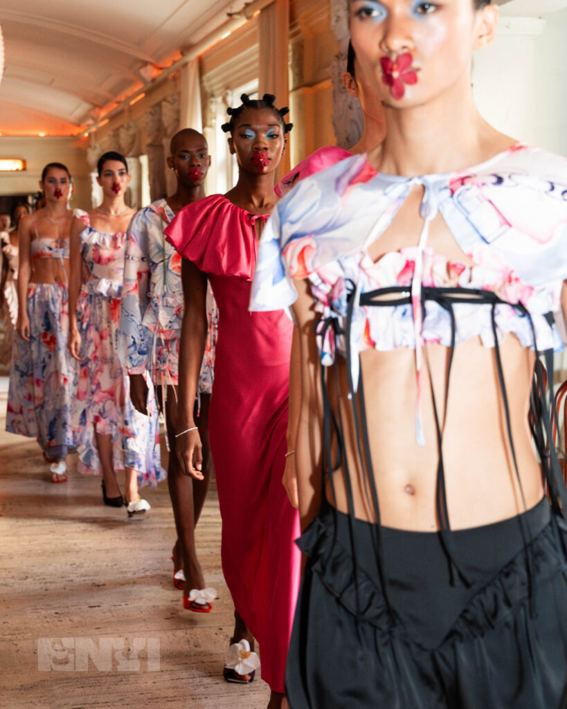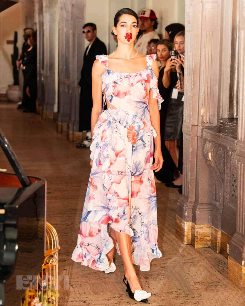 The runway itself underscored the brand’s commitment to intentional storytelling and artistic references. As a live pianist filled the space with delicate notes, models moved through with their orchid appliqués glued to their lips, and yes, they were real. Where components were tied in beautifully from head toe — trailing details, flowing skirts, and juxtaposing shapes signified one thing. Opposites attract, and beauty coexists with silence. “Who’s To Say That Love Needs To Be Soft And Gentle?” featured an array of colors. Dresses in painterly watercolor patterns that remind you of a late summer evening and vibrant hues ranging from coral to fiery red were pushed back by the structured pieces covered in monochrome black.
