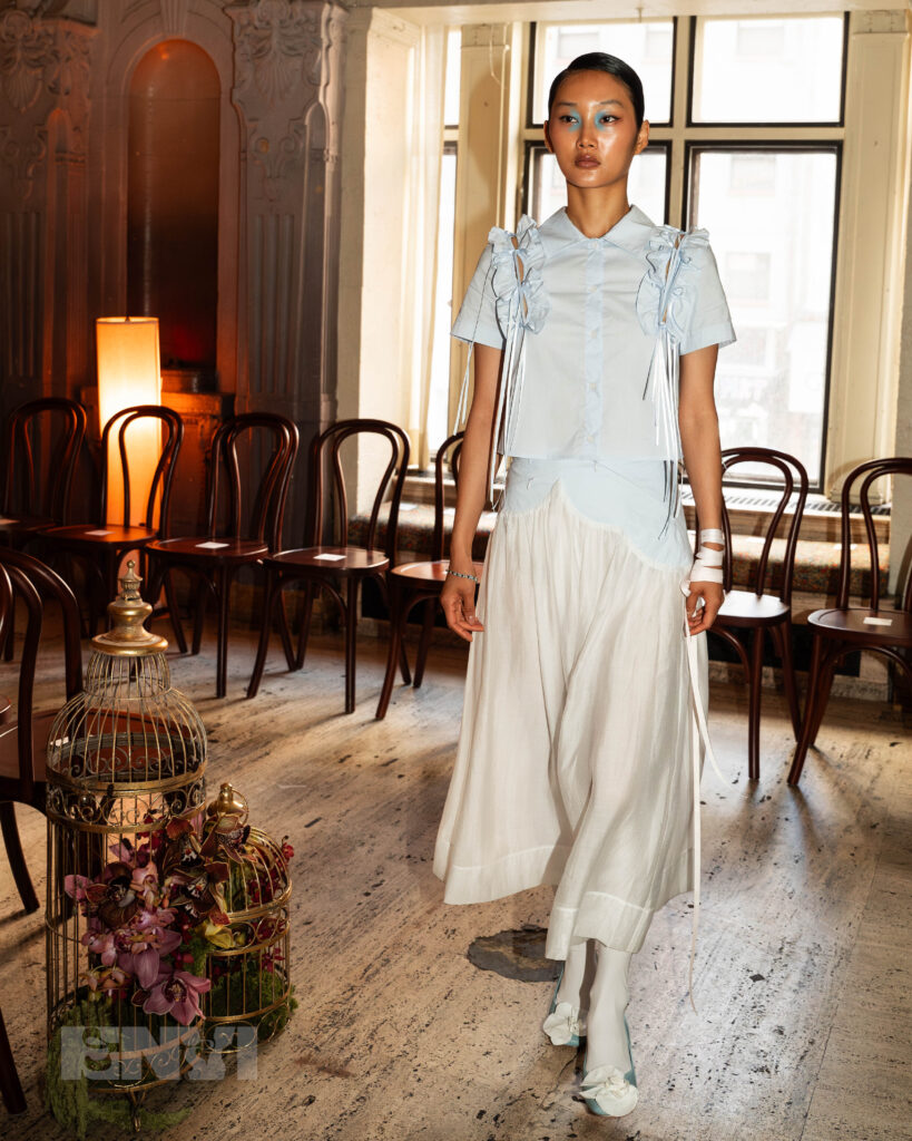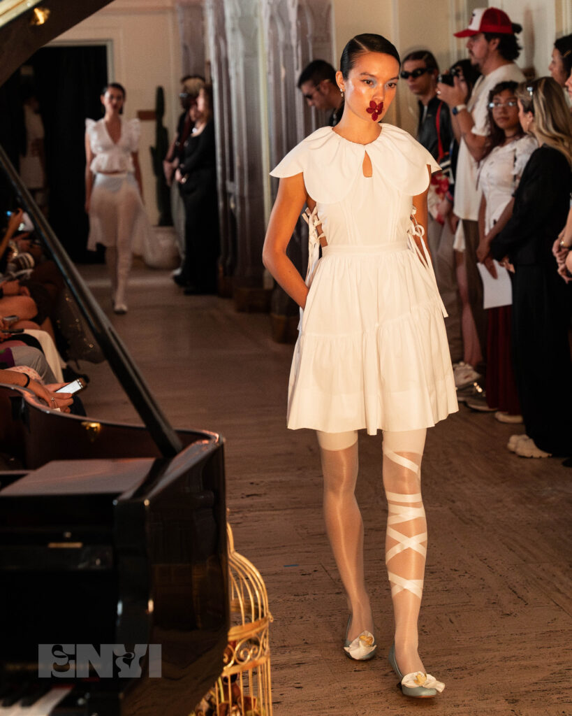 Despite SS26 being Allina Liu’s first NYFW runway, the label isn’t even remotely new to carving a distinct voice within slow, independent fashion. Since its opening in 2015, the brand remains headstrong in its loyalty to quality and wearable collections, not to mention its effortless attention to detail. That ethos stays grounded through her ongoing collaboration with Brooklyn-based material lab TômTex, devoted to creating the new class of next-gen materials. Garments consisted of statement stockings, unconventional accessorizing, and an EnVi personal favorite — Peter Pan collars galore.