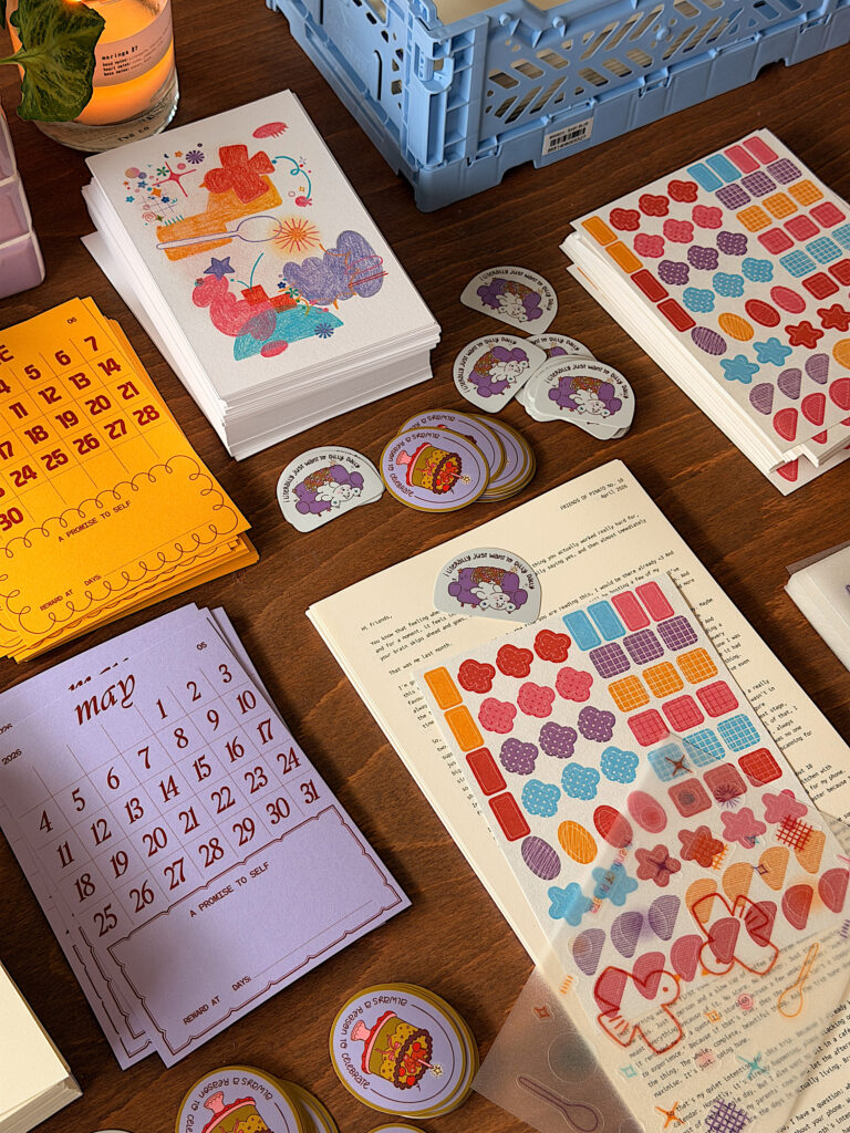 For these artists, the model reinforces sustainability and creative autonomy, while allowing them to remain within reach. While variables like labor, materials, marketing, and shipping all factor into pricing (it is a business, after all), the emphasis on accessibility remains constant. According to Ng, “That is such an easy way to support your artist in their work. Especially with AI being very much present in our lives, it can be quite hard for a lot of illustrators, artists, and creators, and writers to share their work with their community that is handmade or, gone through that creative practice.”