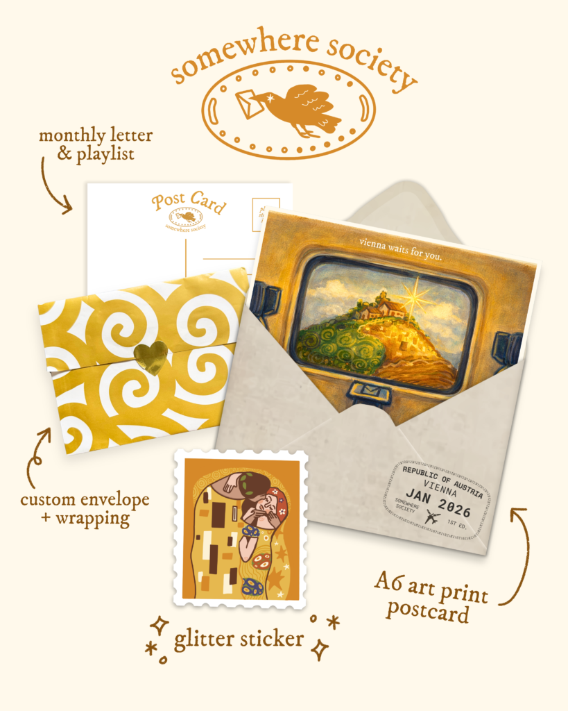 The themes and formats found precisely packaged in a mailer vary widely, reflecting the range of creative mediums and perspectives within mail clubs. Some, like Gan’s Somewhere Society, focus on travel-based art. “I usually pick the city a month in advance, and I try to tie it to a personal memory or experience,” she says. “My inspiration mostly comes from travel, but it’s personal, not touristy. […] It’s more about how I felt seeing Monet’s paintings for the first time, or a memory tied to a city or a piece of art.”