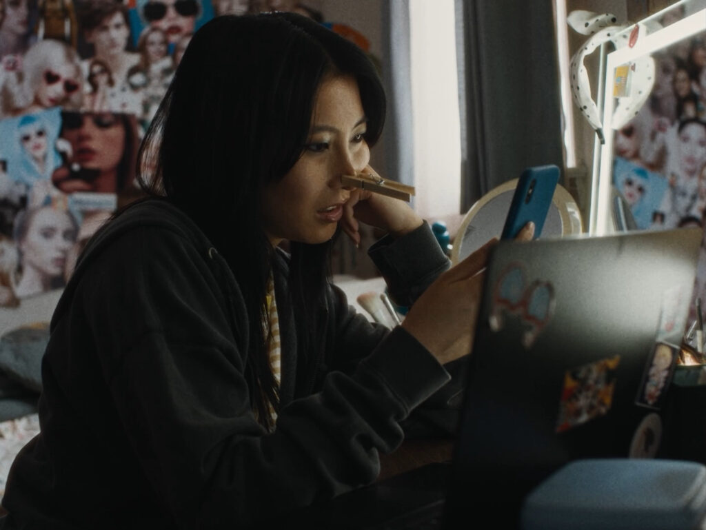 Now in high school, Joan is more insecure than ever of her appearance. She indulges in filters that give her blonde hair, blue eyes, and a high nose. In a striking scene reminiscent of The Substance, Joan walks down a hallway of framed past prom royalty, an eerie and twinkling melody resonating in the background as she stares at the large portraits towering over her.
