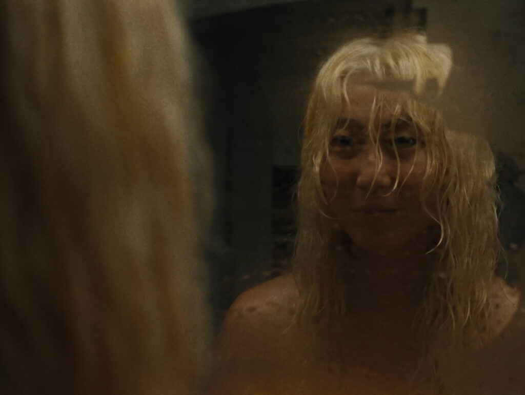 Desperate and anguished, Joan ferociously tears at her face, clawing and ripping away her skin. As she peels back her bloody skin to reveal her original monolid eyes, she stares at her reflection and smiles tearfully, embracing a newfound vision of herself.