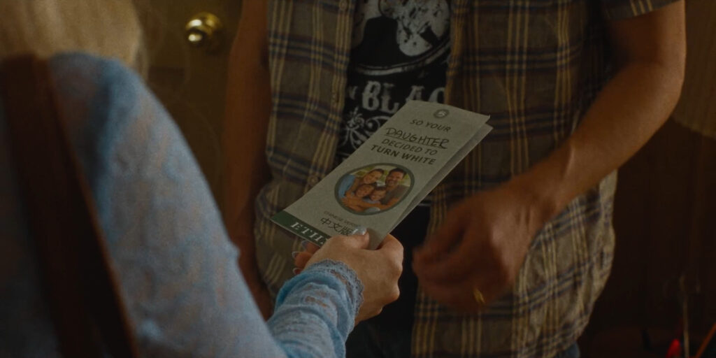 โItโs good to be white,โ a generic infomercial pop number sings over a montage of white people doing stereotypically โwhiteโ activities. With that, Jo awakens to a head of blonde hair, blue eyes, pale skin, and a brochure in hand for her parents.