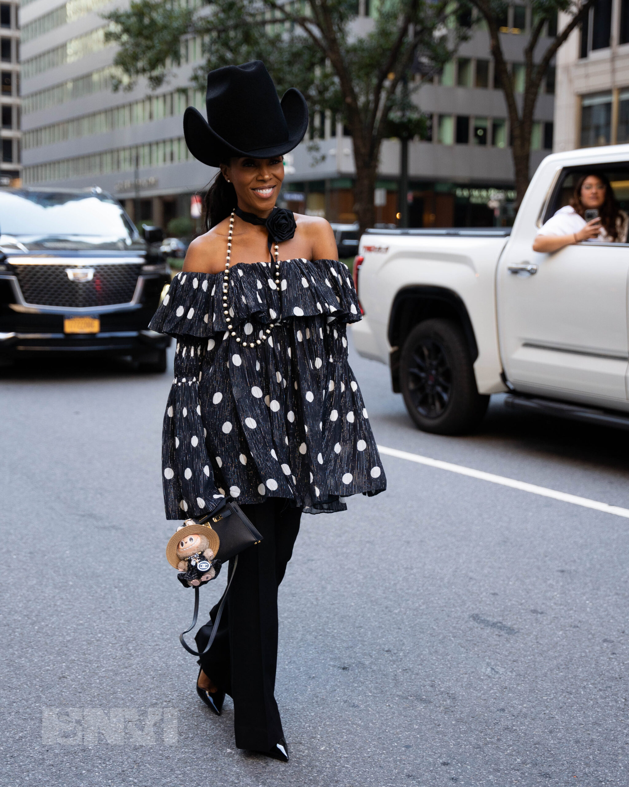 NEW YORK, NEW YORK – A guest outside the Sandy Liang show. Photo by Radiya Aheto