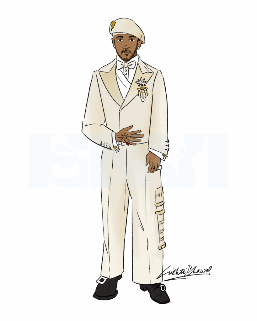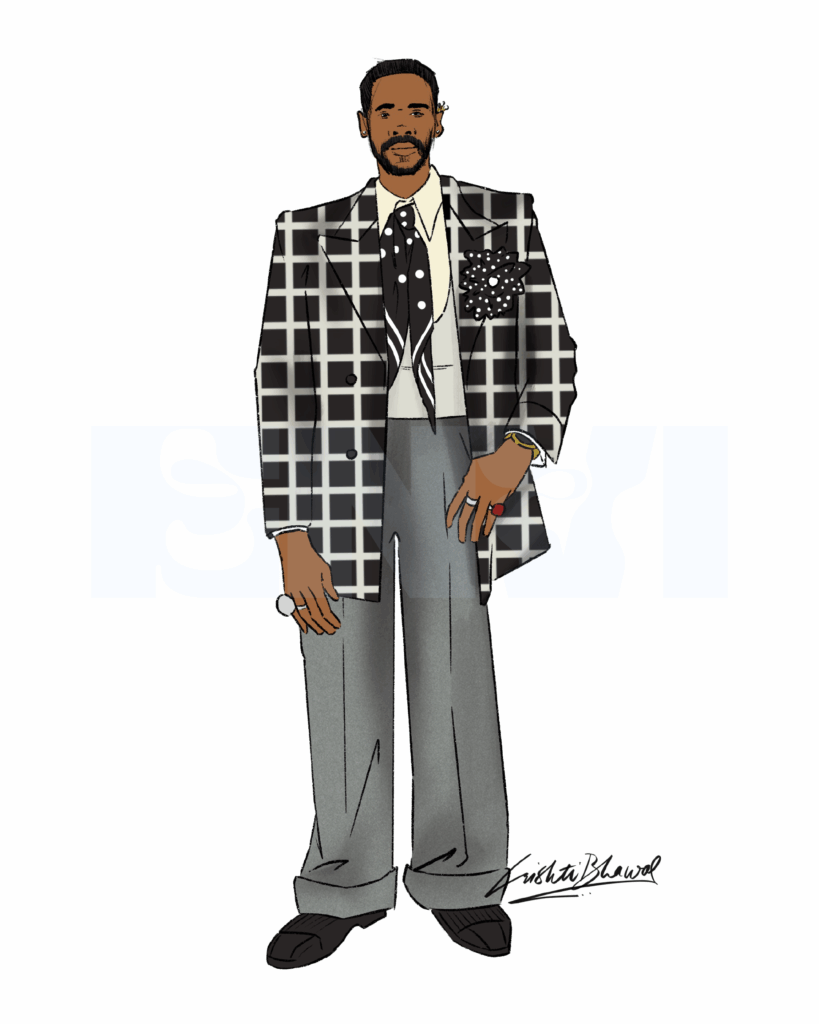As one of the co-chairs of the Met Gala, Colman Domingo’s outfits were heavily anticipated. Dressed by Valentino, Colman’s embellished collar and blue cape gave way to a 3-piece zoot suit that perfectly captured the theme of Black dandyism at the Gala. I was enamored by the intricate checkered embroidery on the suit jacket and the host of accessories, including a polka dot flower on his lapel, a matching silk scarf in place of a tie, and striking rings and ear cuffs that drew my eye across his entire ensemble   — Srishti Bhawal, Graphic Designer