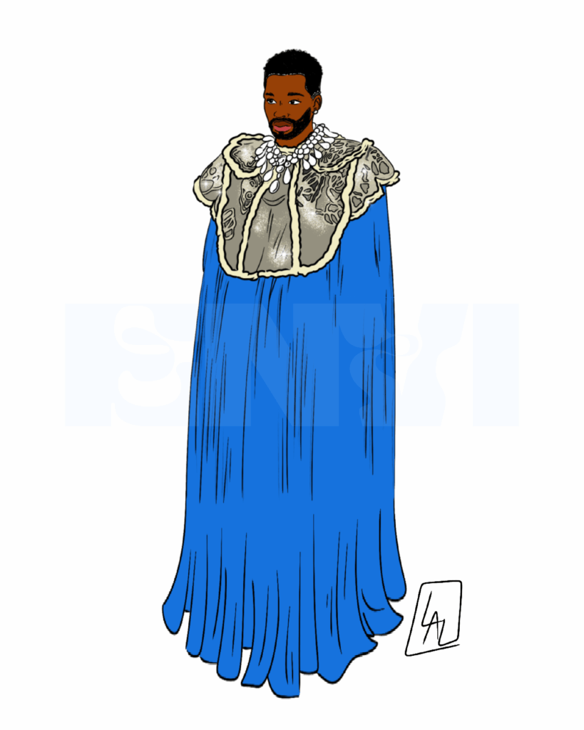 I found the duality of Colman Domingo’s Valentino outfit to be very intriguing in that it’s very simple yet detailed at the same time. The long pleated blue cape reminds me of the theater, and I like the gleaming details of the collar. The entire look has a very regal essence to me, which was not only intriguing to see, but to draw as well. — Leigh Langston, Graphic Designer