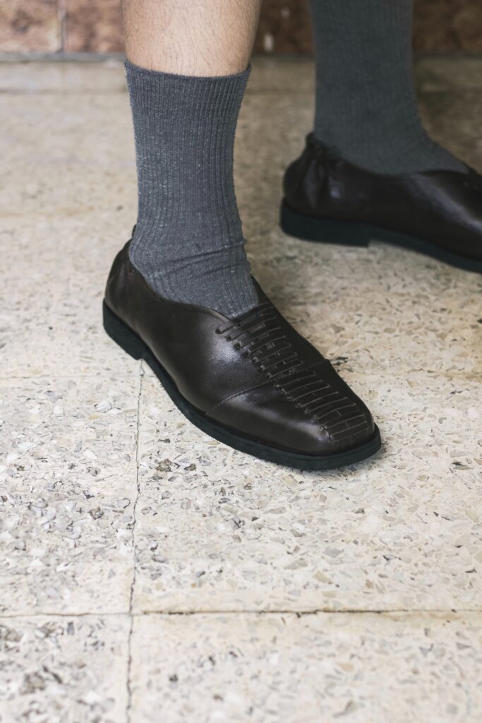 Designed as an extension of movement and breath. The Prana Flat Loafers feature a distinctive silhouette that balances exposure and coverage — revealing glimpses of the foot while remaining grounded in form. A leather lacing detail on the upper adds subtle character and adjustability, shaping the shoe naturally to the wearer.