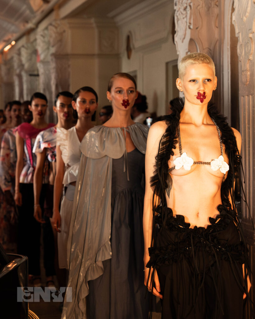 The runway itself underscored the brand’s commitment to intentional storytelling and artistic references. As a live pianist filled the space with delicate notes, models moved through with their orchid appliqués glued to their lips, and yes, they were real. Where components were tied in beautifully from head toe — trailing details, flowing skirts, and juxtaposing shapes signified one thing. Opposites attract, and beauty coexists with silence. “Who’s To Say That Love Needs To Be Soft And Gentle?” featured an array of colors. Dresses in painterly watercolor patterns that remind you of a late summer evening and vibrant hues ranging from coral to fiery red were pushed back by the structured pieces covered in monochrome black.