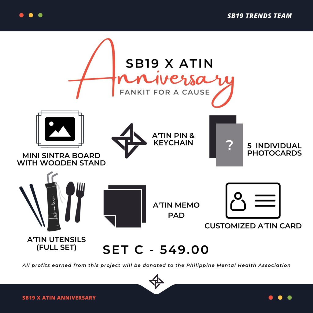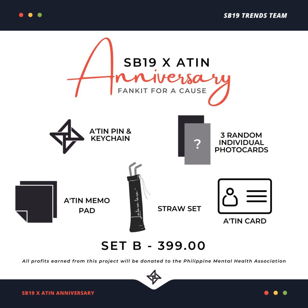 #ATINFankitForACause is a Philippines-based project created by A’TIN fan bases to celebrate SB19’s third anniversary on October 26 and the second anniversary of the A’TIN fandom, created on November 2. Three fan bases, SB19TrendsPH, SB19BOOST, and sb19nized came together to work on marketing, accounting, customer service, packaging, and distribution of fan kits for the project.